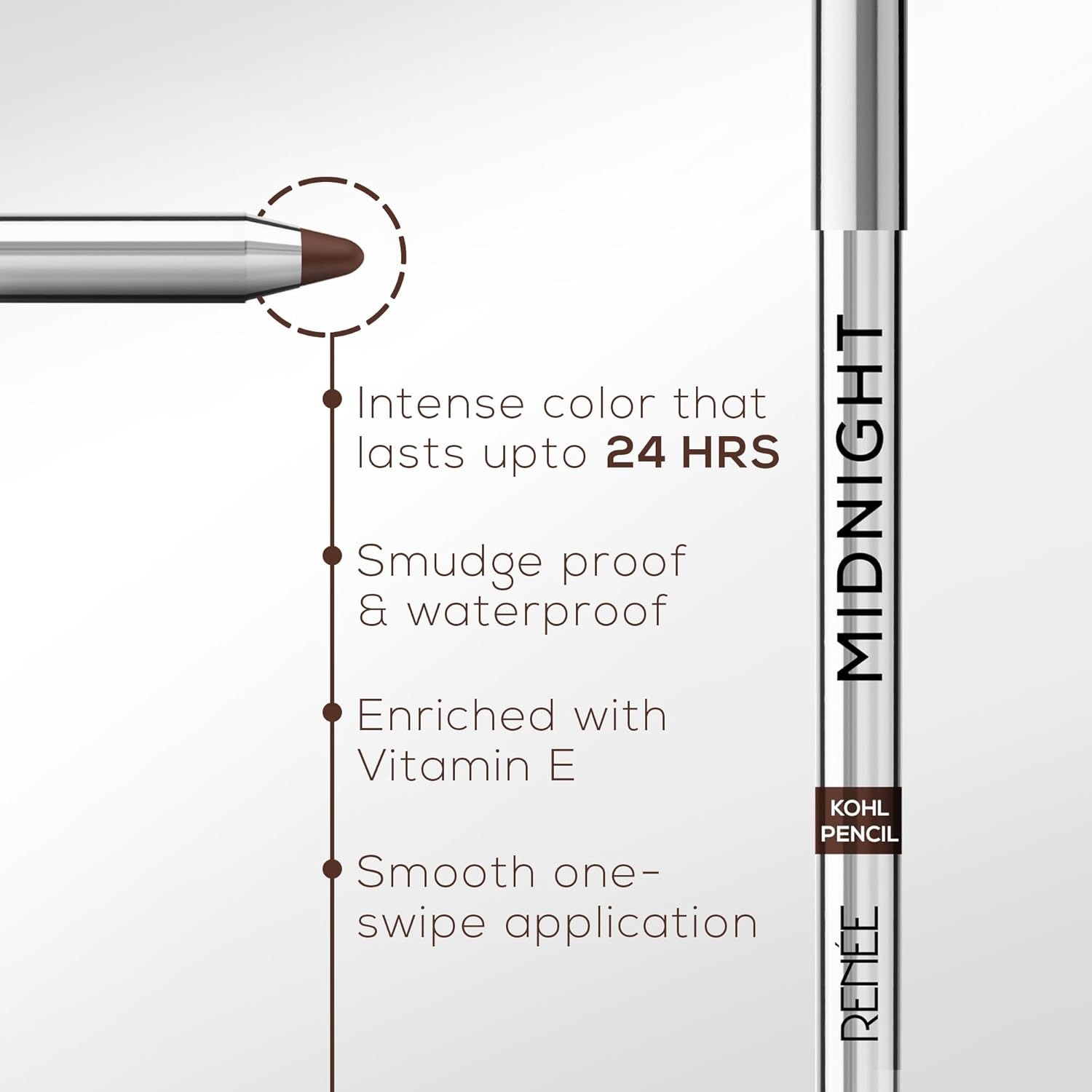 RENEE Midnight Kohl Kajal Pencil | Waterproof, Smudgeproof With Sharpener | 24 Hours Long Stay | Darkest Black | One Swipe Application | Vitamin E, Olive Oil and Castor Oil | Matte Finish |1.5 Gm